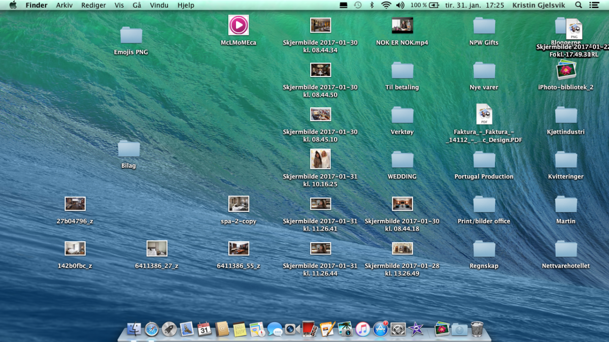 7. Hva har du som skjermbilde på Macen? Nå får nok alle dere ordensmennesker helt fnatt, for sånn ser skrivebordet mitt ut. Her er hverken et trivelig bakgrunnsbilde eller ordning og reda, og jeg lover både dere og meg selv å rydde opp i det her. Skrivebordet mitt skal bli så trivelig atte hjelp, haha.