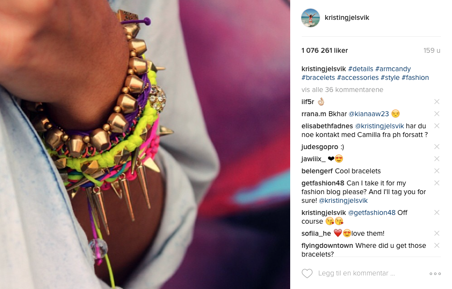 10. Hvilket av bildene dine på Instagram har fått flest likes? Det er faktisk et eneste stort mysterium, for mitt mest likte bilde har fått over 1 million likes! Og det er et bilde Dennis har tatt av ambåndene mine, liksom. Merkelig, sarru? Så sjukt merkelig. Det strømmer fortsatt inn likes på dette bildet, så hva som har skjedd må jo Instagudene vite, haha.