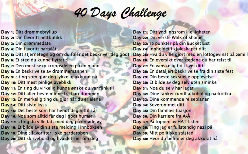 Guess what? Jeg skal nå gå i gang med en sånn herlig 40 dagers challenge som x antall bloggere har drevet på med den siste tiden. Flere av dere har nemlig spurt om jeg kan gjøre det samme, men jeg har hatt litt problemer med å faktisk gå til verks med denne challengen etter jeg kjørte på med nettopp en slik for ca 1 år siden. (her) Jeg ble jo så sinnsykt lei av hele greien, men nå har jeg laget en spennende og personlig challenge, fremfor det skvipet som beveger seg i bloggverden.