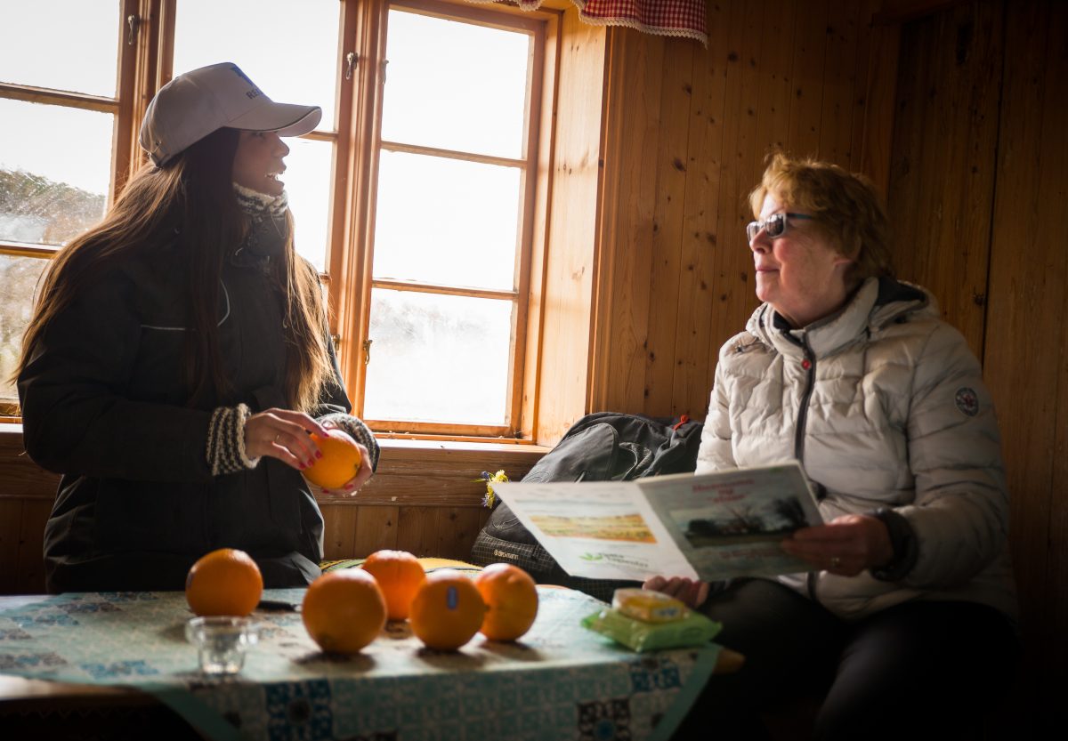 Dagen etterpå inviterte hun oss ut på en lang og deilig tur på Tjøtta, hvor hun nok en gang delte gode historier fra gamledager, og det ble til og med tid til en liten pause med appelsiner og flere gode samtaler - helt magisk!