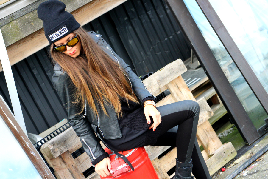 Leggings fra H&M // vintage skinnjakke fra Kiliwatch // boots fra Geztus/Neomania (her) // strikk fra Only // lue fra Choies (her) // Solbriller fra Oakley (her) // klokke fra Nixon
