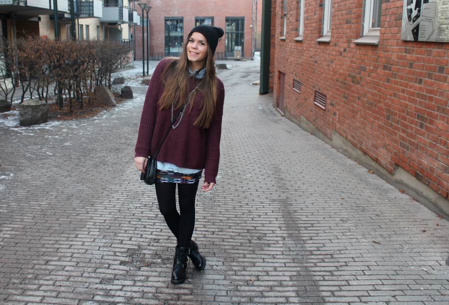 Skjørt og genser fra New Yorker // vintage denimskjorte fra Kiliwatch // boots fra DnA // veske funnet i skapet til mamma // smykker fra Nelly/ Gun necklace fra Friis (her) // lue fra Cocco Accessories
