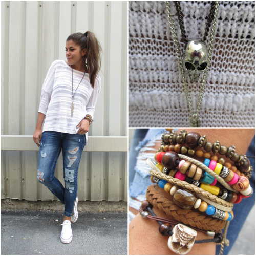 Ny jeans fra Bershka, genser fra Bik Bok, smykker fra Nelly/TopShop, armbånd fra Aldo, og Converse på beina.