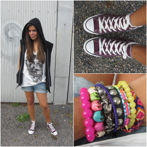 Shorts fra Only, topp fra WESC, vest fra H&M, armbånd fra Ettika/eBay/Pieces/Aldo, og mørk lilla Converse, kjøpt i Dubai.