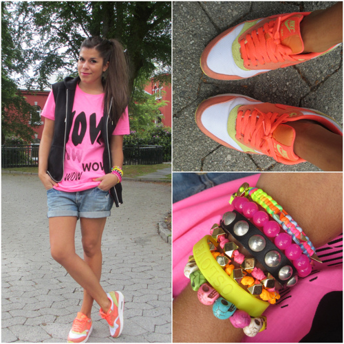 Shorts fra Vero Moda, ny unisex t-shirt fra SOMeWEaR (Junkyard) Kjøpes HER, vest fra H&M, sko fra Nike (Junkyard), og armbånd fra Ettika/Pieces/Oslove/Aldo.