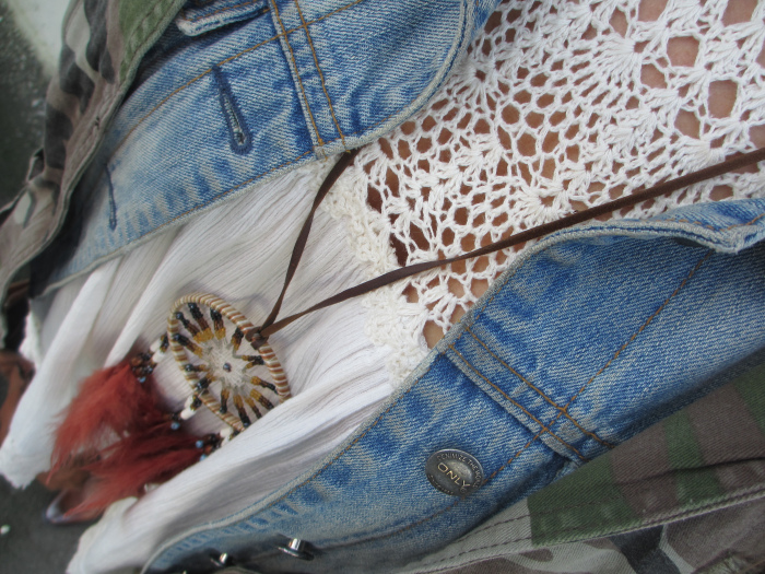 Kjole fra Object, denimvest fra Only, jakke fra Pull & Bear, drømmefanger brukt som smykke fra Spania, mine nye boots som jeg elsker fra MJUS/Footway (HER), veske fra Pieces, og armbånd fra Pieces/H&M.