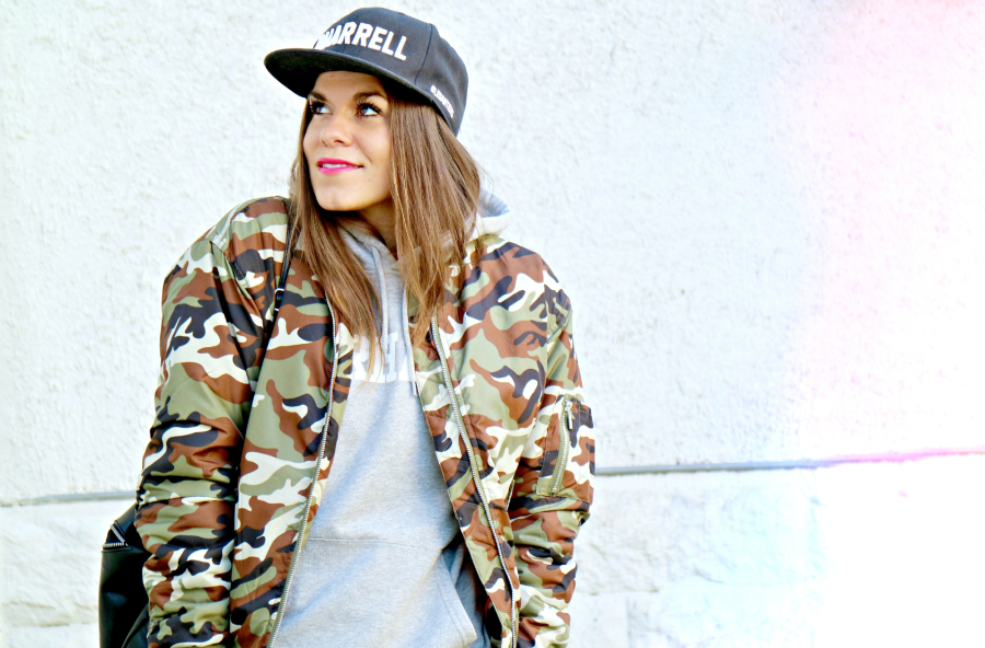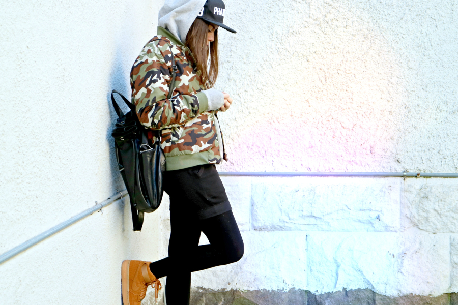 Hoodie fra Carhartt HER // Bomber fra Junkyard HER // Snapback fra Junkyard // Sneakers fra Nike // Skjørt fra StyleConnection HER // Ryggsekk fra H&M