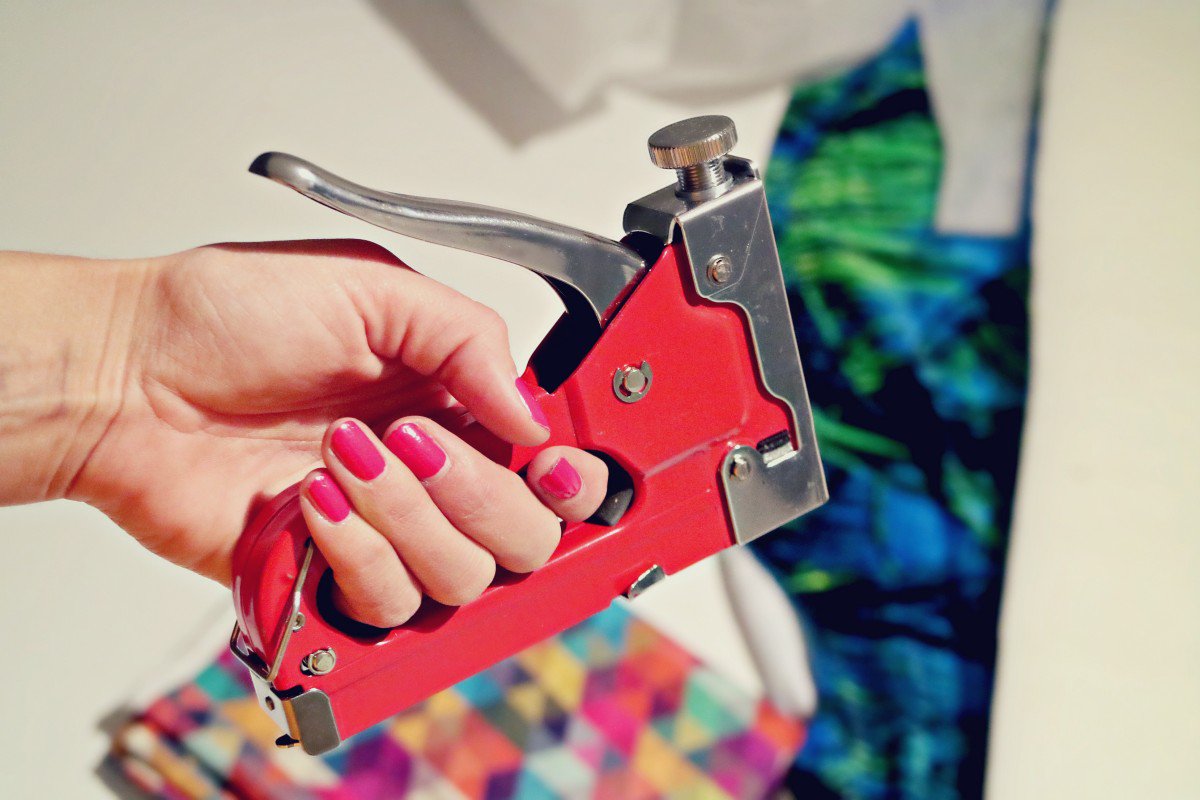 En plate (sponplate eller møbelplate som fås kjøpt hos bl.a Maxbo) • Skumplast eller såkalt hobbyskum (Stoff og Stil har et godt utvalg) • Møbelvatt • Spraylim (fås kjøpt hos bl.a Maxbo) • Valgfri tekstil • En solid stiftemaskin som dere ser på bildet under.