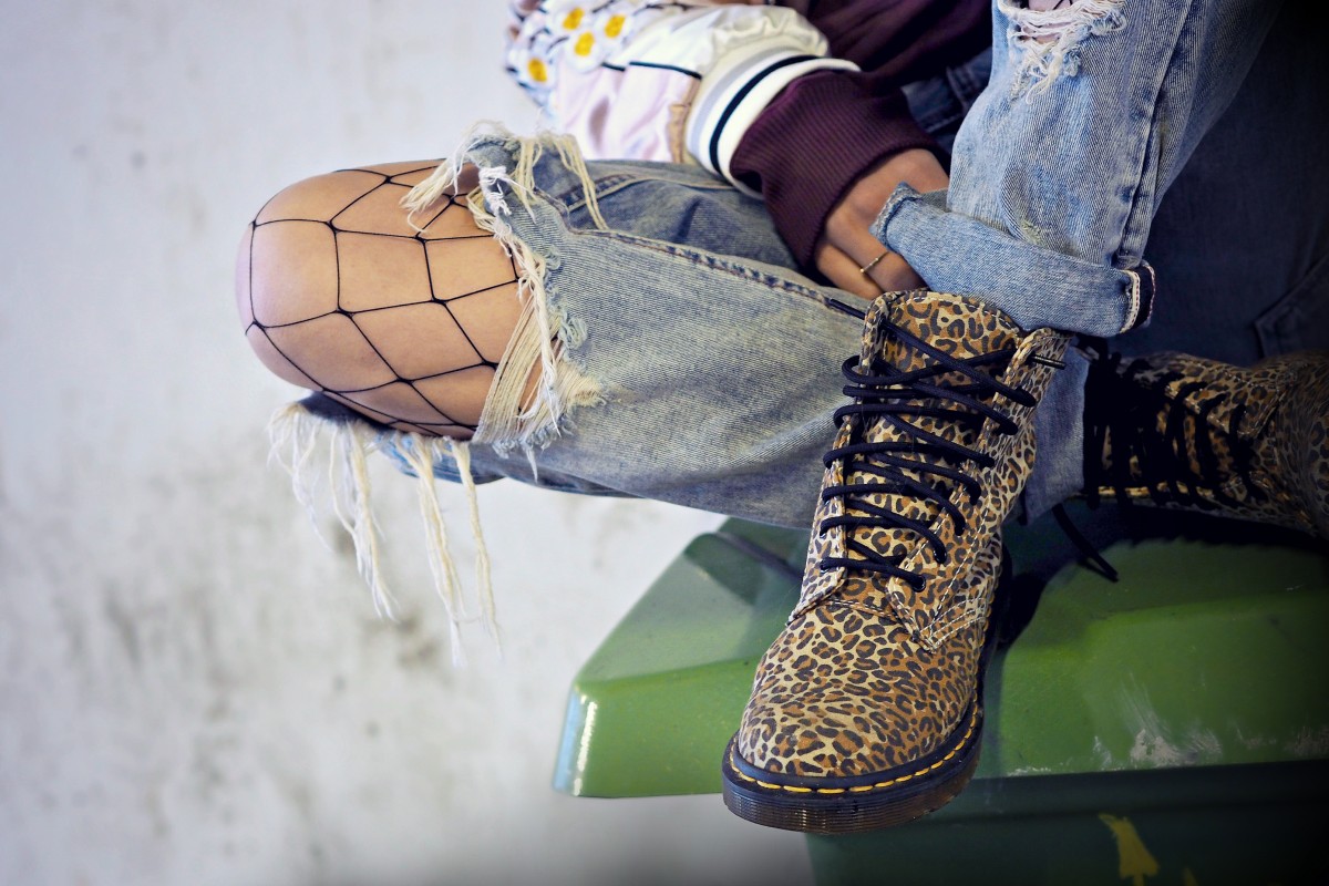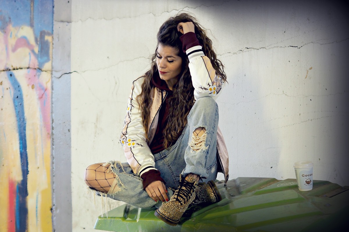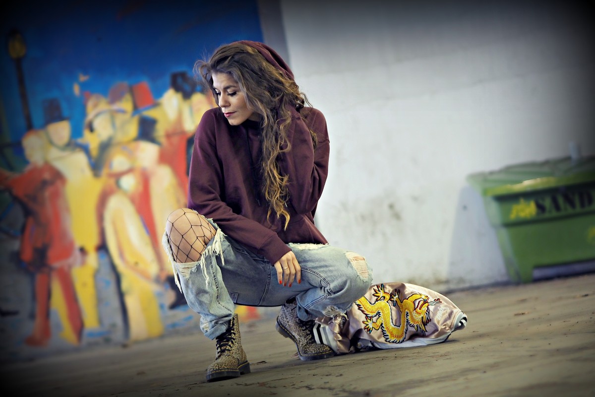 Inneholder ikke affiliateslinks: Nettingstrømpebukse HER // Hoodie fra Junkyard HER // Boyfriend jeans fra Pimkie // Boots fra Dr. Martens // Bomber fra Sixt June HER //