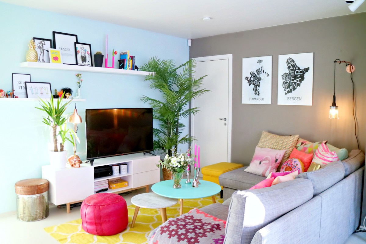 Jeg ser at jeg trenger litt flere fargerike bilder, og noen mørkere stearinlys i den neonrosa lysestaken, men alt i alt er dette den fresheste og hyggeligste løsningen vi har hatt her i stuen. Etter vi flyttet sofaen ble det også mer koselig, så nå er stuen definitivt mitt favorittrom her i cribben.
