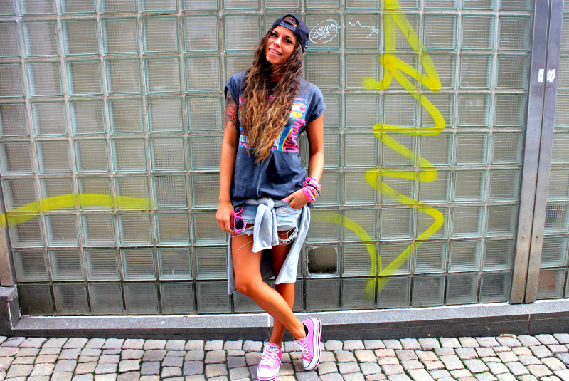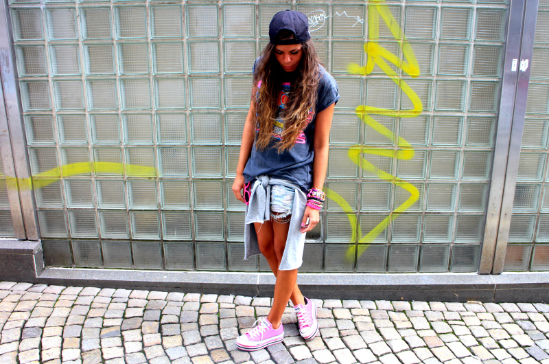 T-shirt fra Bik Bok (her) // denimshorts fra Bershka // genser rundt livet fra Just Female og Storheil Agenturer // Platform Converse fra Urban // snapback fra Junkyard // armbånd fra Ettika/Aldo/Pieces/Bershka // solbriller fra Hawaii // neglelakk fra OPI - «Strawberry Margarita» toppet med «Which is Witch»