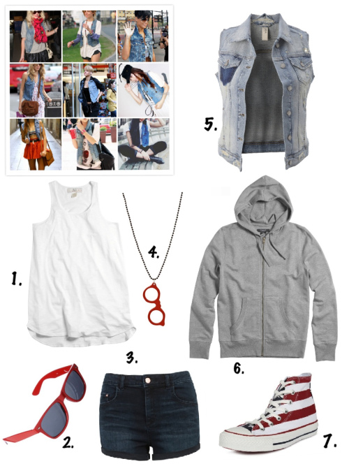 1. Slækk topp Herfra 2. Solbriller Herfra 3. Shorts Tisvarende lysere variant Herfra 4. Smykke Herfra 5. Jeansvest fra Gina Tricot 6. Sweat Herfra 7. Converse Herfra