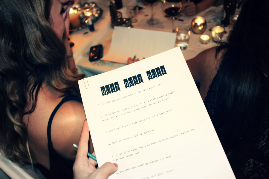 Åh, for en flink vertinne du er! Jeg skal arrangere jentenes julebord til helgen, så dette var god inspirasjon! Kunne du lagt ut quizen? Jeg har nemlig tenk på å ha en quiz selv, men er litt usikker på hvordan type. Ellers har jeg et spørsmål til, jeg har bestemt meg for å gi alle en oppgave under middagen, typ \»du skal skåle minst 5 ganger under middagen\», \»hver gang det blir skålet skal du nynne på en julesang\», MEN jeg vet bare ikke hvordan jeg skal få delt ut disse oppgavene uten at alle forstår det. Noen forslag? :O