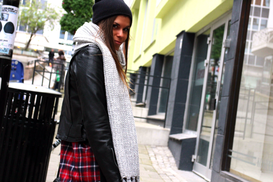 Vintage skinnjakke fra Kiliwatch // skjerf fra Monki // superdigg flanellskjorte fra Daniel Franck (her) // jeans fra Bik Bok // boots fra Neomania (her) // neglelakk fra OPI i fargen «Lost on Lombard»
