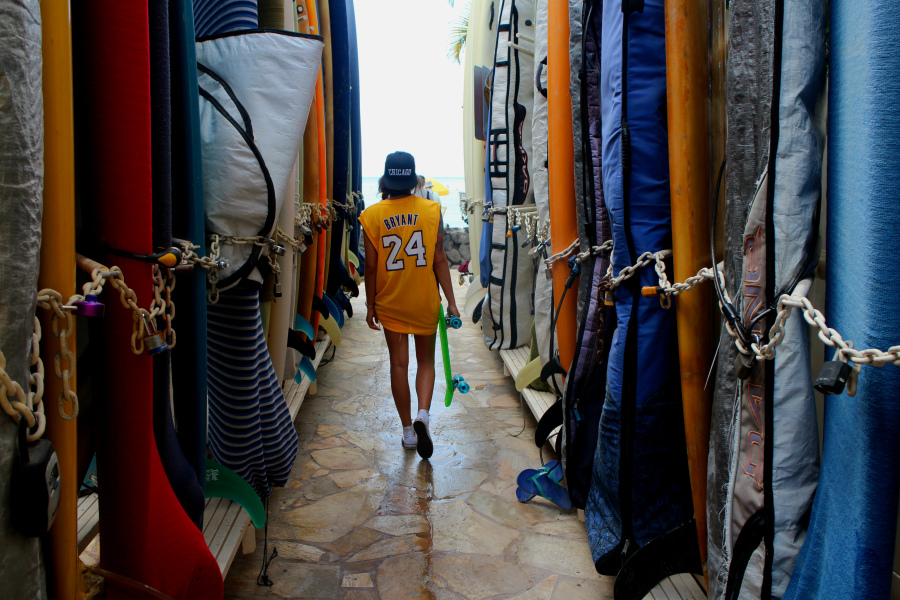 Vi skal straks sette oss til bords, for her er det jo kveld (som dere vet) og Caspar har laget deilig mat til oss. Mmmmm…. Så mens vi spiser og hygger i godt selskap denne siste kvelden på Hawaii, kan dere ta en titt på dagens outfit. Endelig fikk jeg brukt både den nye Lakers-toppen min og i tillegg testet ut det nye cruiserbrettet mitt fra Globe/Junkyard (her). Wuuuhuuuuu!