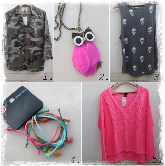 1. Armyjakke fra Pull&Bear 2. Smykke fra Blanco 3. Topp fra Pull&Bear 4. armbånd fra Blanco 5. Oversized neon rosa genser fra H&M.