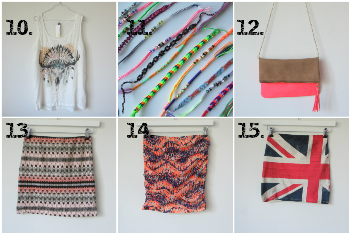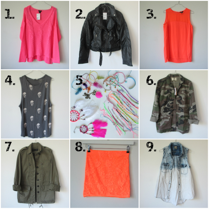 1. Genser fra H&M, 2. Jakke fra H&M, 3. Topp fra H&M, 4. Topp fra Pull & Bear, 5. Diverse accessories fra Blanco/marked 6. Jakke fra Pull & Bear, 7. Jakke fra Zara, 8. skjørt fra Bershka, 9. Denimskjorte fra Bershka, 10. Topp fra Pimkie, 11. Armbånd fra marked 12. Veske fra H&M, 13. Skjørt fra Bershka 14. Skjørt fra Berska 15. Skjørt fra Bershka