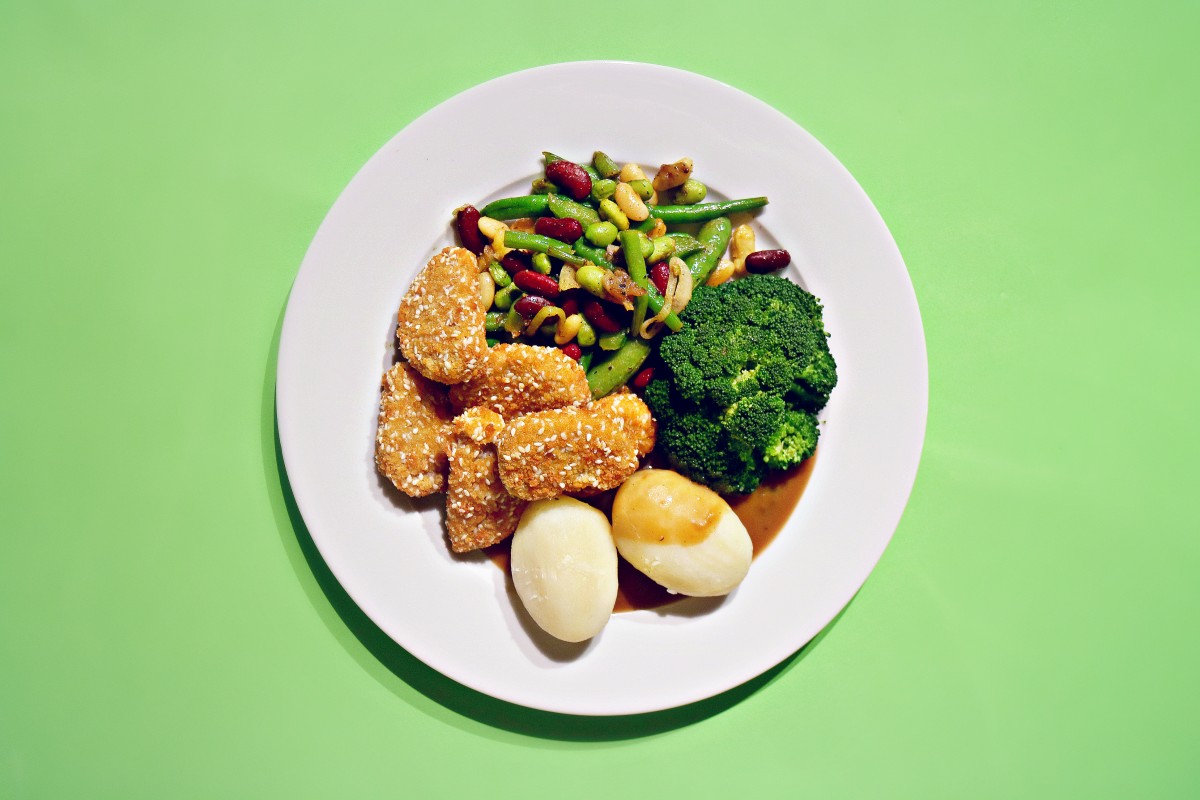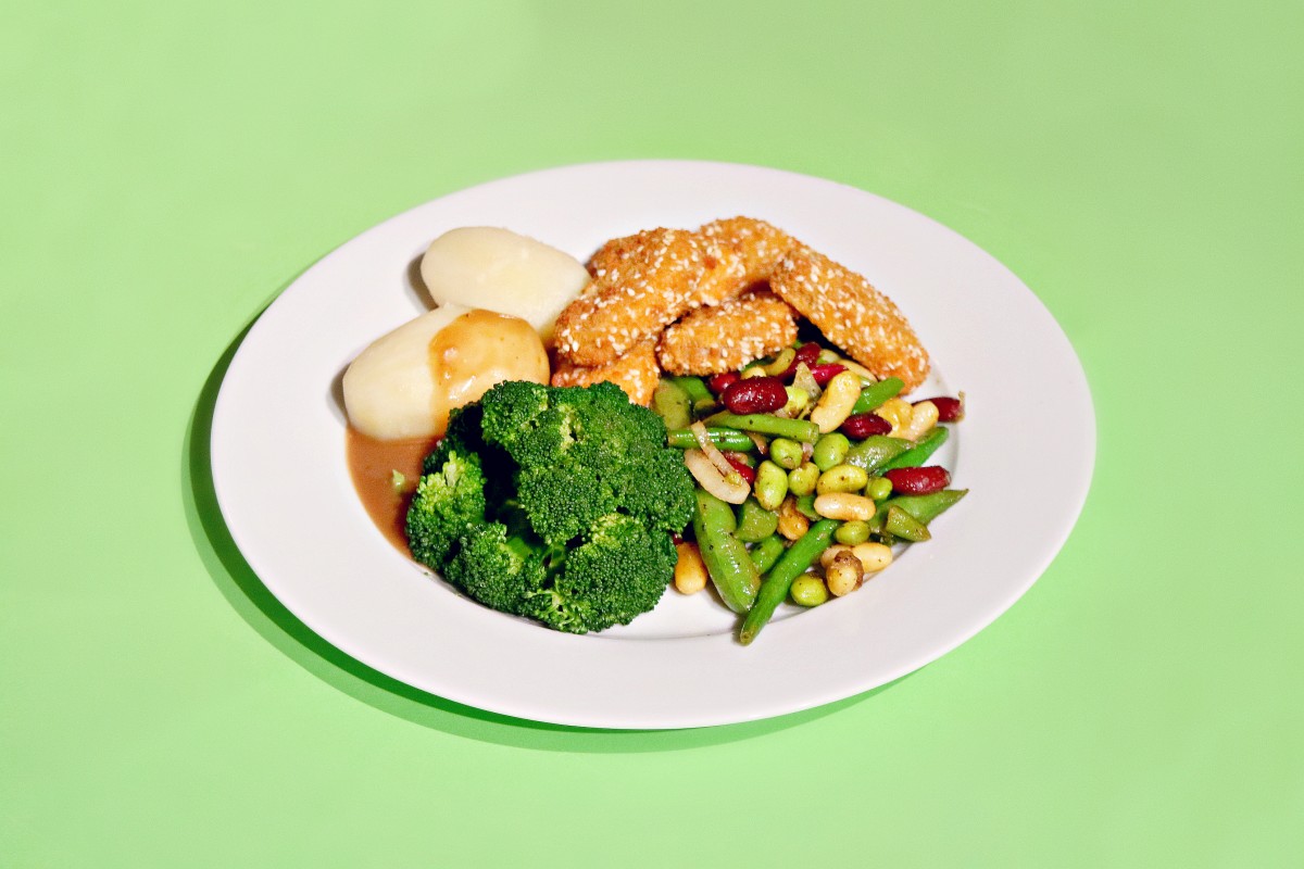 1 pakke med veganske soyanuggets (finnes i frysedisken i de fleste dagligvarebutikker) • 1 pose bønneblanding (frysedisken på Rema 1000) • Ferdigkokte poteter (så går det ekstra raskt) • 1/2 brokkoli