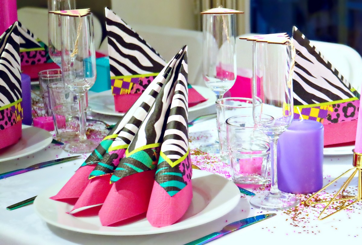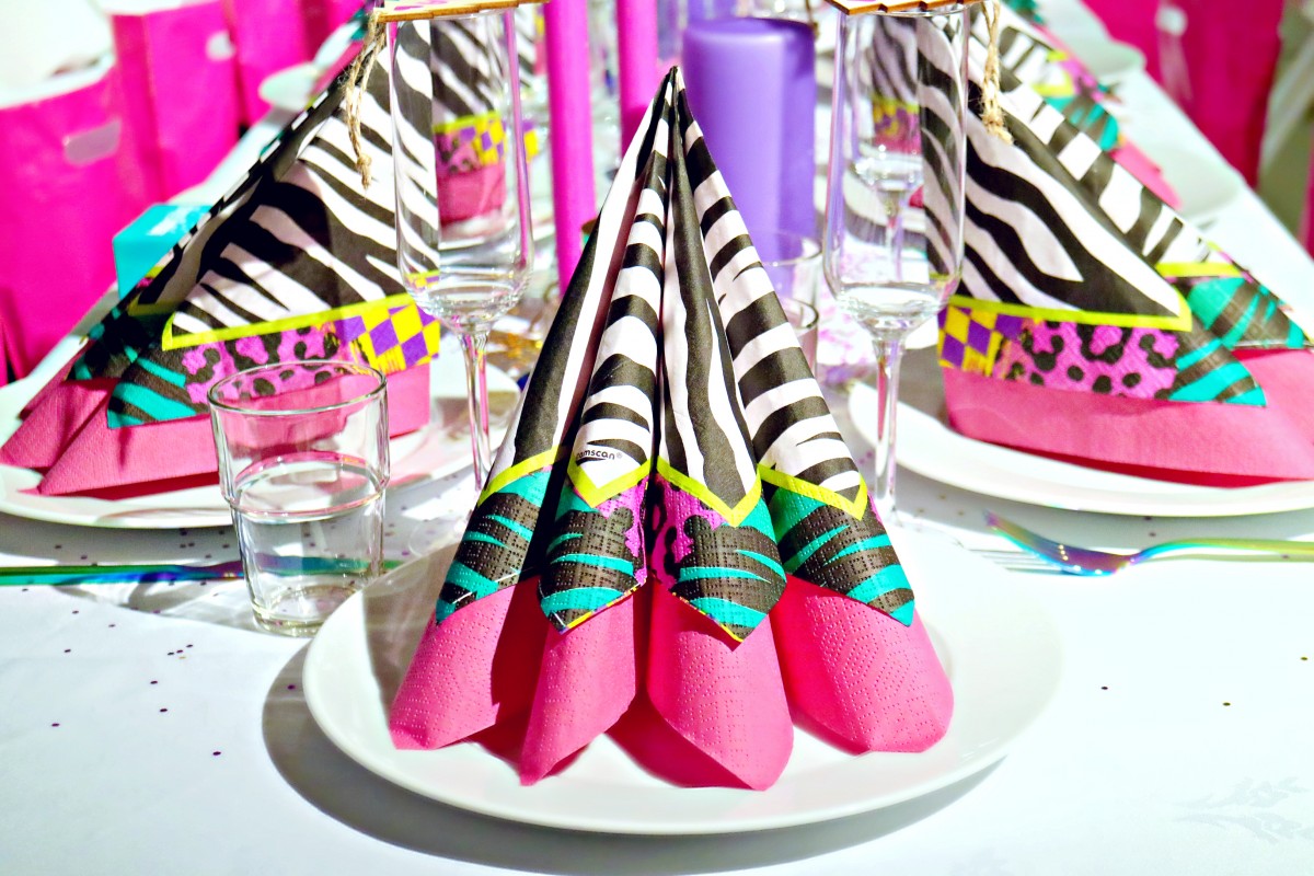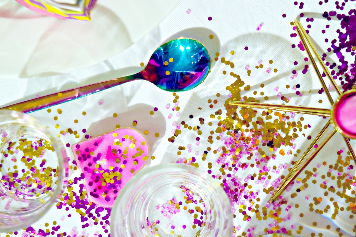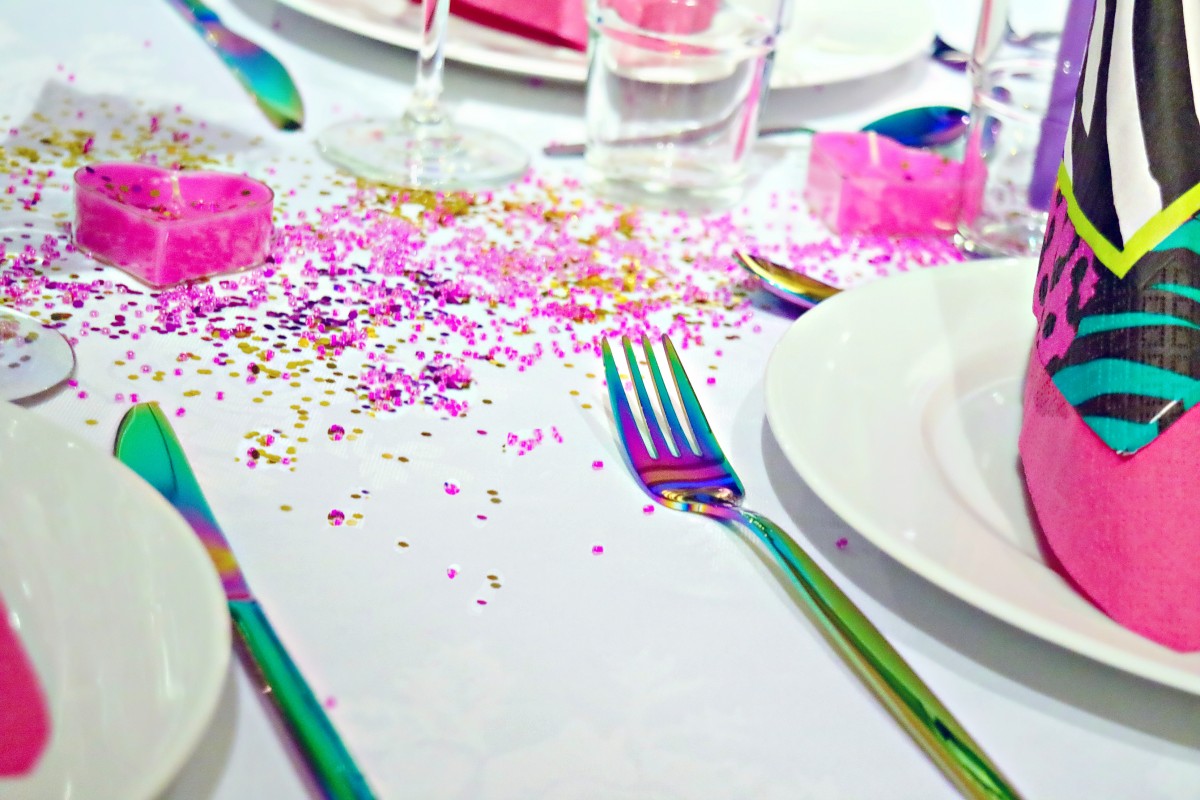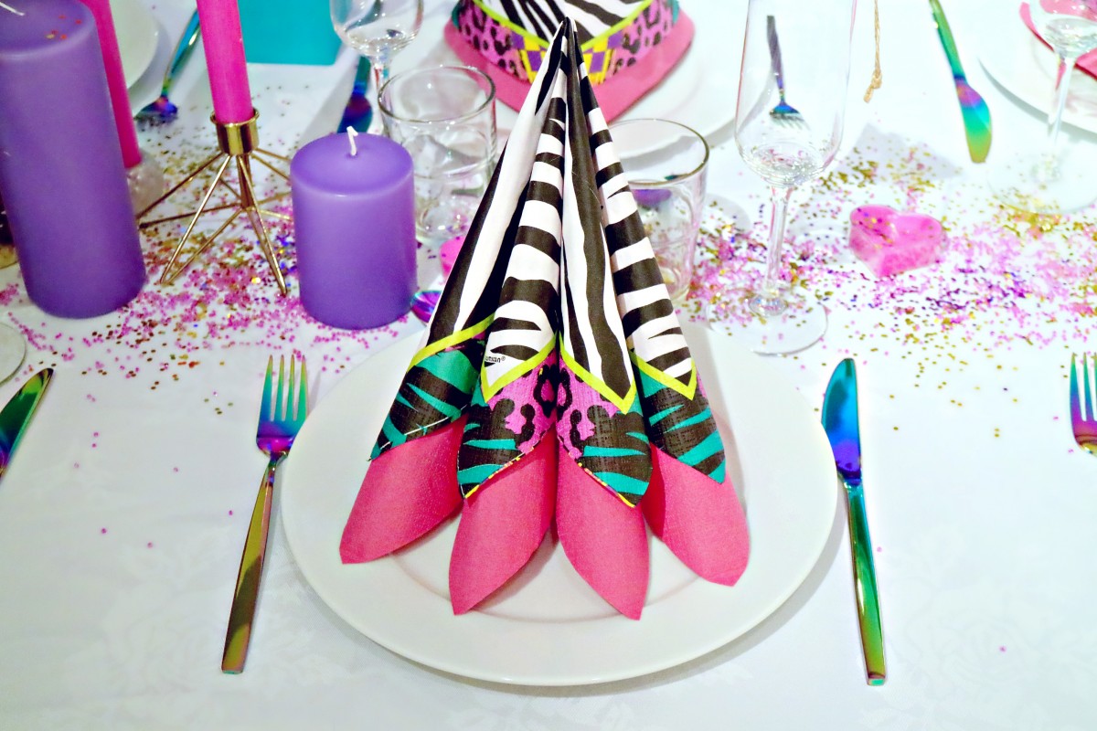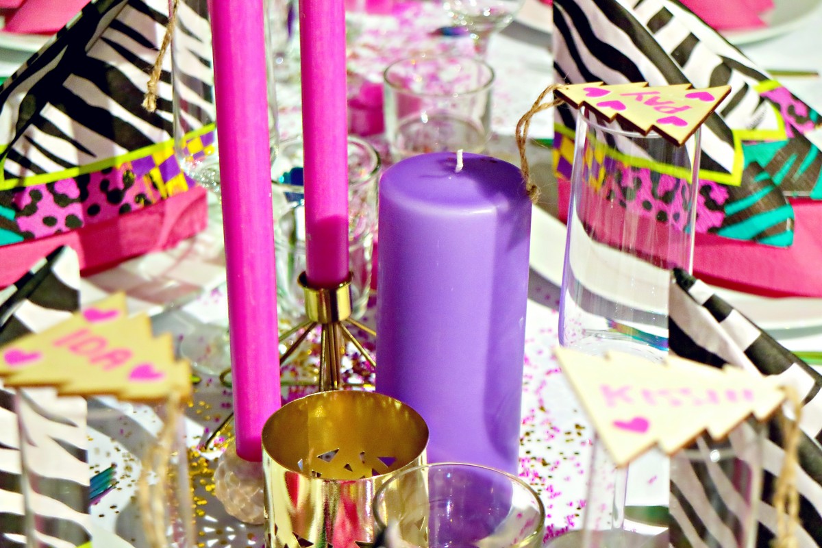 Det skal virkelig ikke så mye til - hemmeligheten ligger i de små detaljene som får stor betydning! Som dekorasjon på bordet, brukte jeg både glitter i gull og lilla, samt små rosa og lilla perler fra TGR. Dette kostet under hundre kroner, og er en superenkel måte å tilføre ekstra sprudde. Lysene i lilla og rosa er også fra TGR, de rosa serviettene er fra IKEA, og de møsntrete serviettene er fra Superkul.no. Ganske så fresht, ikke sant?