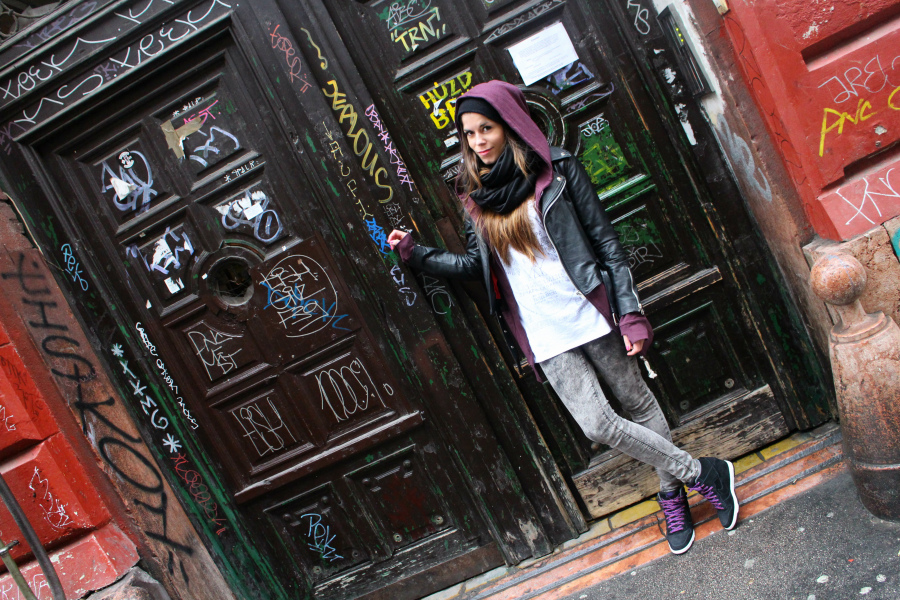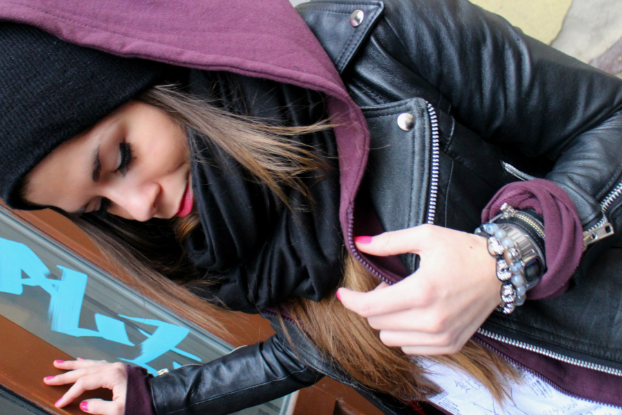 Topp fra Zara // vintage skinnjakke fra Kiliwatch // hoodie fra Junkyard (her) // jeans fra Bershka // nye sko fra Nike // tubeskjerf fra New Yorker // lue fra Cocco Accessories // armbånd fra Miinto/Nelly // Ny fantastisk klokke fra Casio (her)