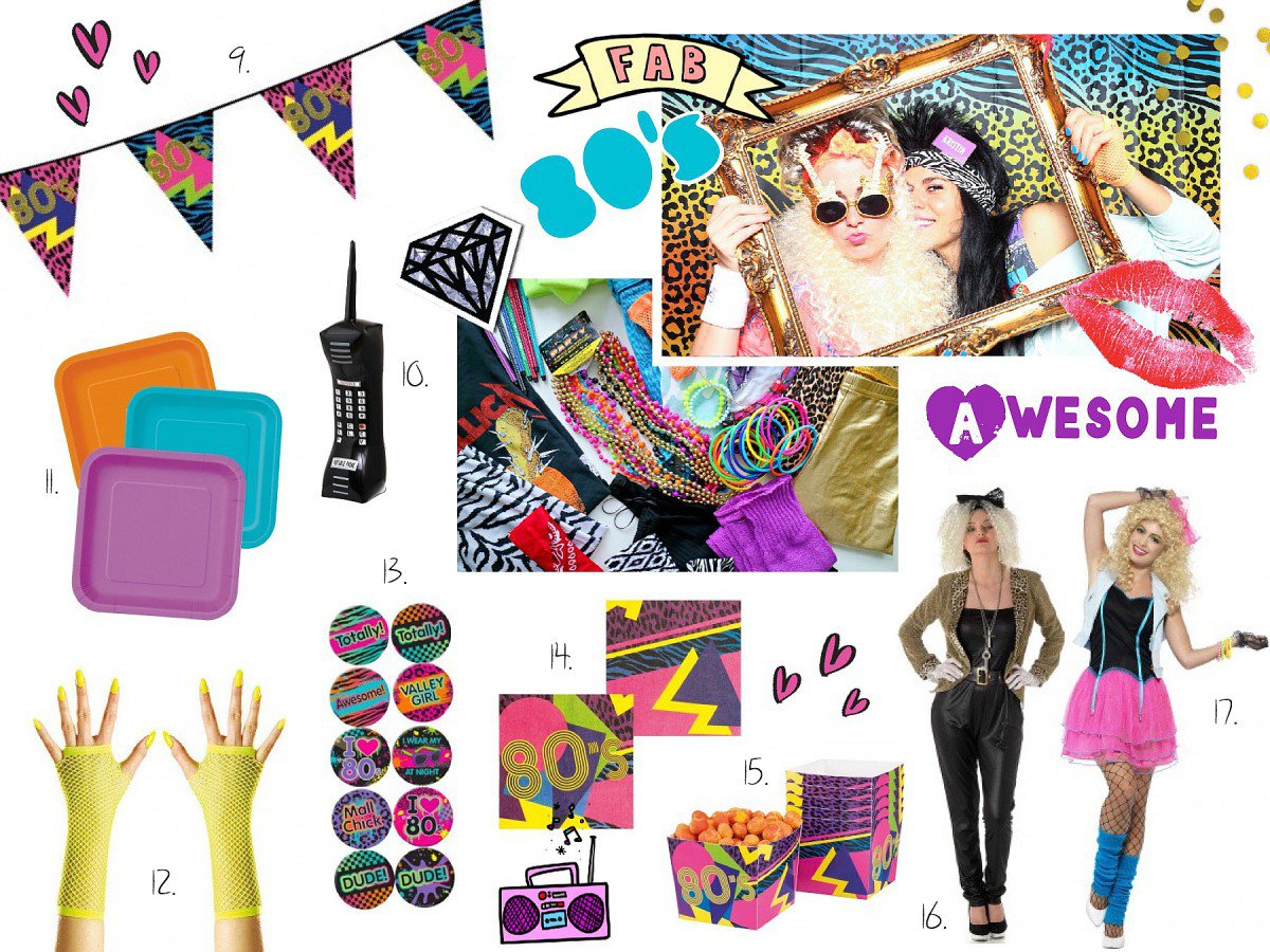 9. 6 meter 80-talls banner HER 10. Oppblåsbar retro mobiltelefon HER 11. Fargerike pappfat HER 12. Neongule nettinghansker HER 13. 80’s buttons - 10 pakning HER 14. Fargerike servietter HER 15. Snacksbeger HER 16. Madonnainspirert kostyme HER 17. 80’s babe kostyme HER