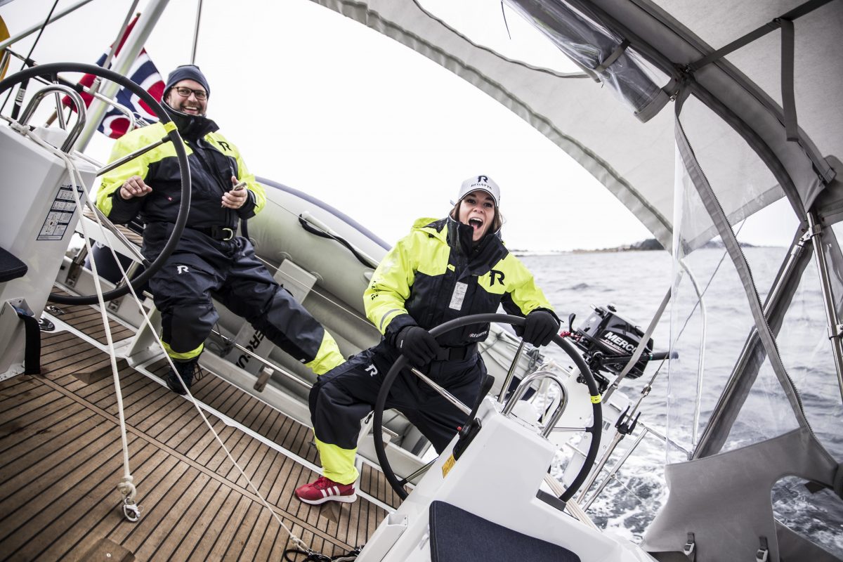 …Bilde: Altså… I går var jeg omsider i form til å ta roret - det som tross alt er mye av poenget med denne turen, og det var rett og slett helt rått å styre skuten i ganske såpass bra seilevær. Strålende sol ville selvsagt gjort opplevelsen enda bedre, men det var så rått å ha ganske god vind i seilene, uten at sjøen var så urolig og ubehagelig. Kan det være jeg begynner å bli mer sjøsterk? La oss i hvert fall håpe på det, hurra! Trine tok det råeste bildet av Rolf og meg i går, og her får man virkelig inntrykk av hvor på skeive en seilbåt faktisk går med vinden rett i seilene. Dette her er jo helt RÅTT!