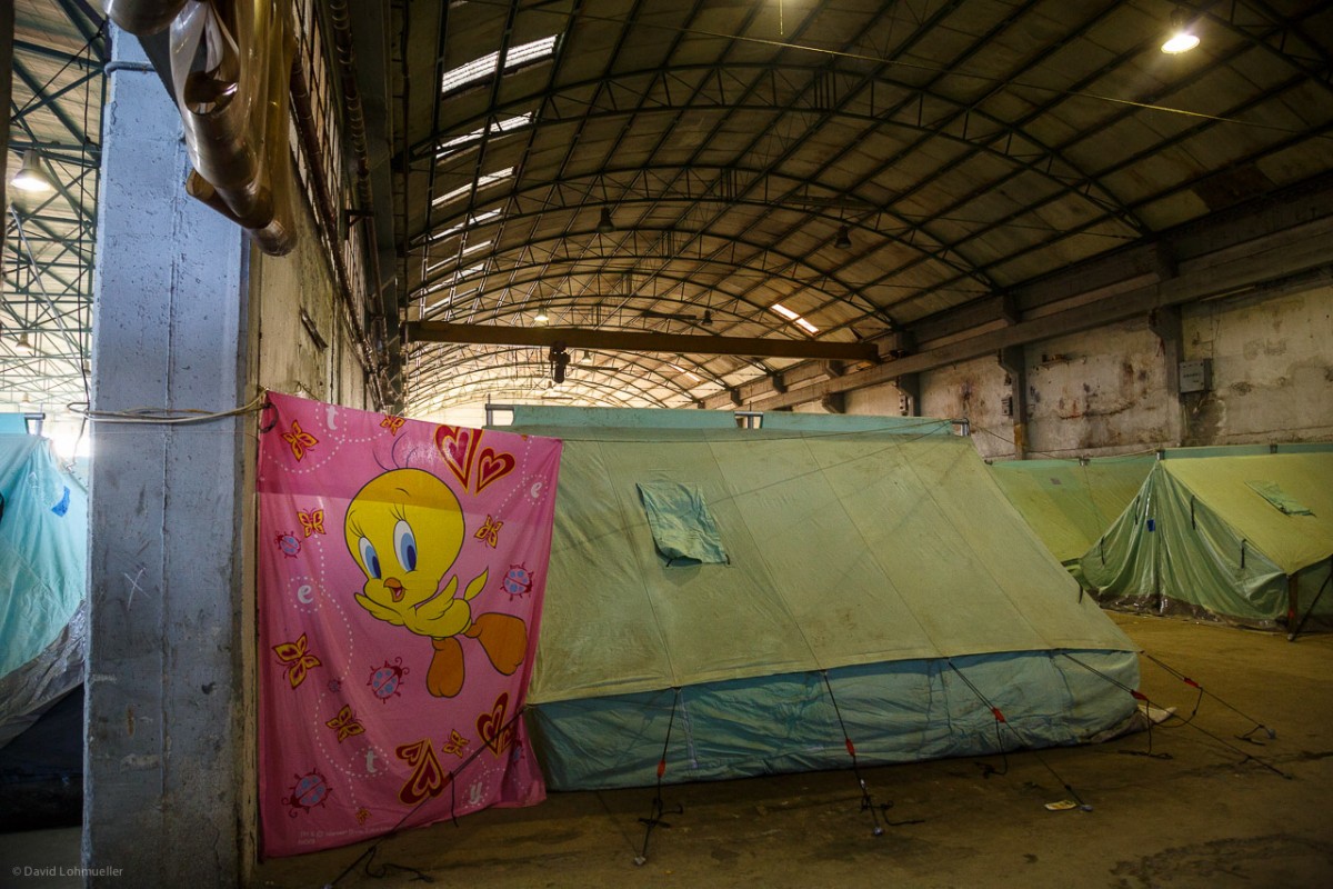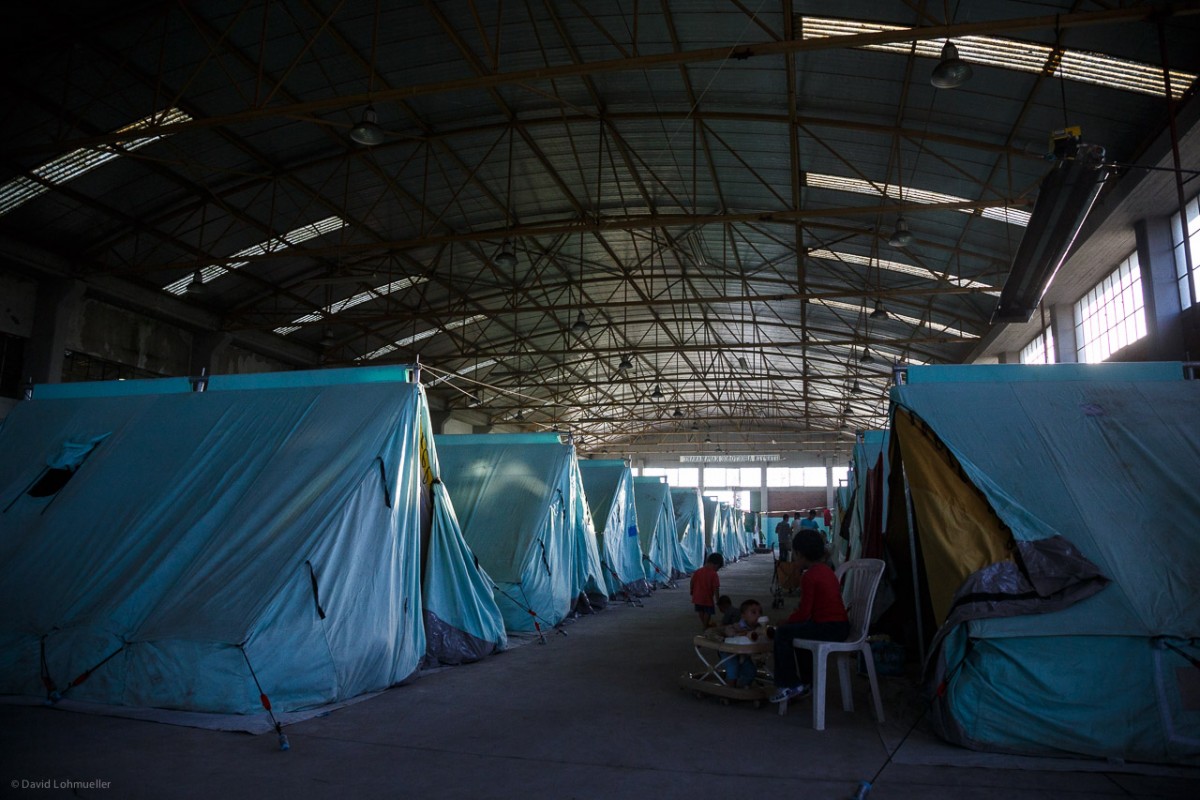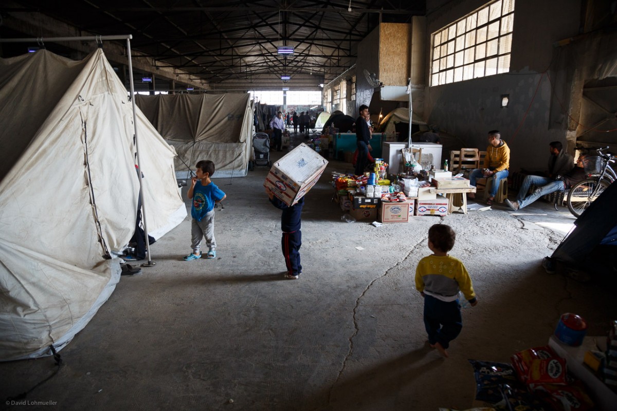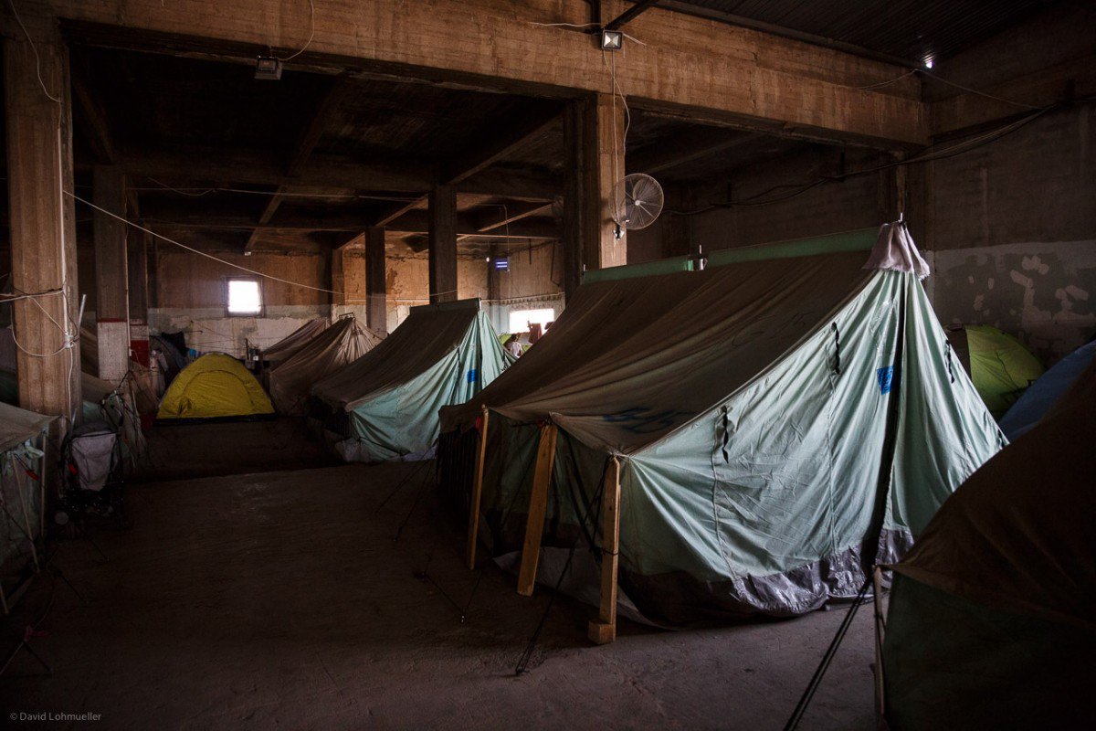 Sindos Karamanlis camp, er satt opp i en forlatt skinnfabrikk.