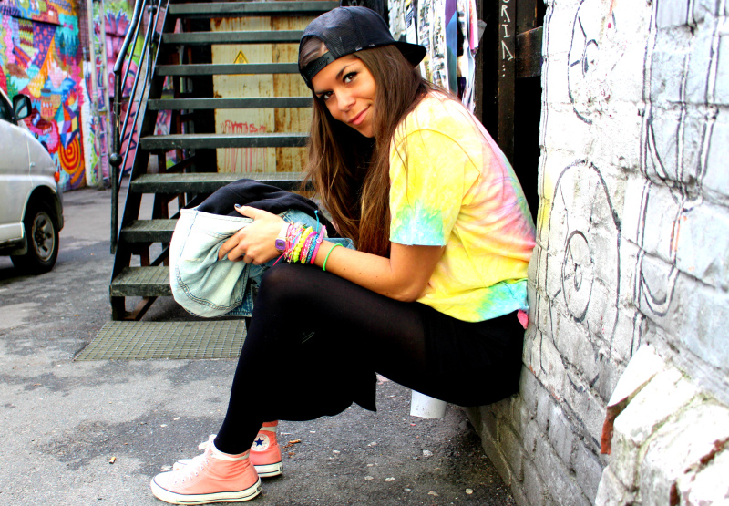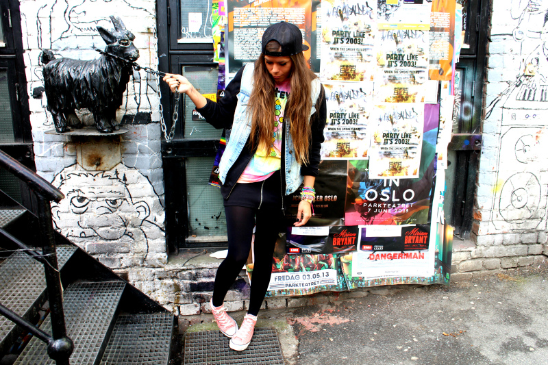 T-shirt fra NastyGal // skjørt fra H&M // Converse kjøpt i Dubai // denimvest fra Only // hoodie fra New Yorker // caps fra WESC/Junkyard (her) // smykke fra TopShop // armbånd fra marked/Ettika/Aldo/Bershka // Casio klokke fra Klokkegiganten (her)